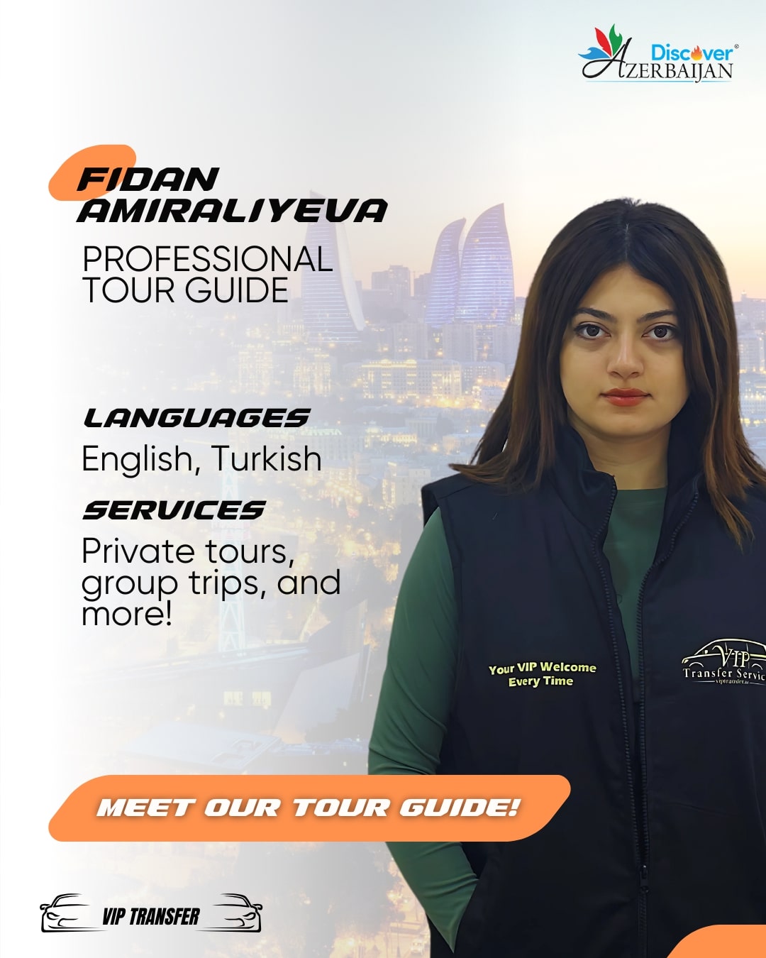 Fidan Amiraliyeva is an experienced professional who delivers high-quality guiding services for both private and group tours. Her fluency in English and Turkish ensures that tourists feel comfortable and well-attended. Her expertise and professionalism make every tour both informative and enjoyable, creating a memorable experience for every guest.